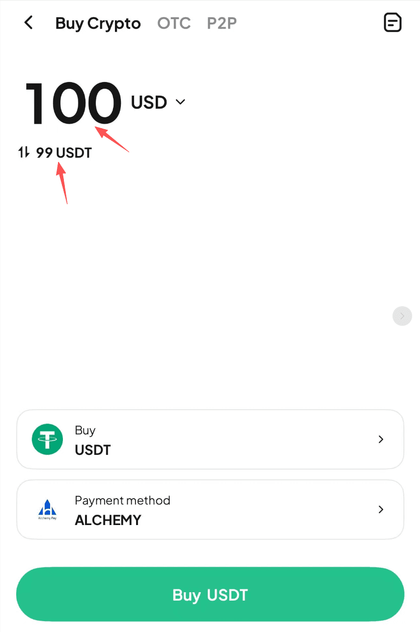 第2步:選擇法定貨幣和[USDT] 加密貨幣,您可以輸入付款金額,然後這將估算您將收到的USDT 金額。