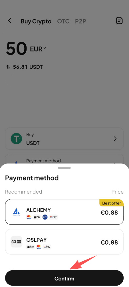 第4步:選擇付款方式後,單擊[買入USDT] ,將買入USDT與EUR 下單。