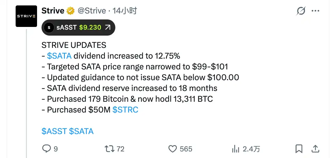 增持 179 枚比特幣,總持股 13,311 枚,價值約 9.3 億美元。自家優先股 SATA 的股息率上調到 12.75%。以及,花 5000 萬美元買了 Strategy 的優先股 STRC。