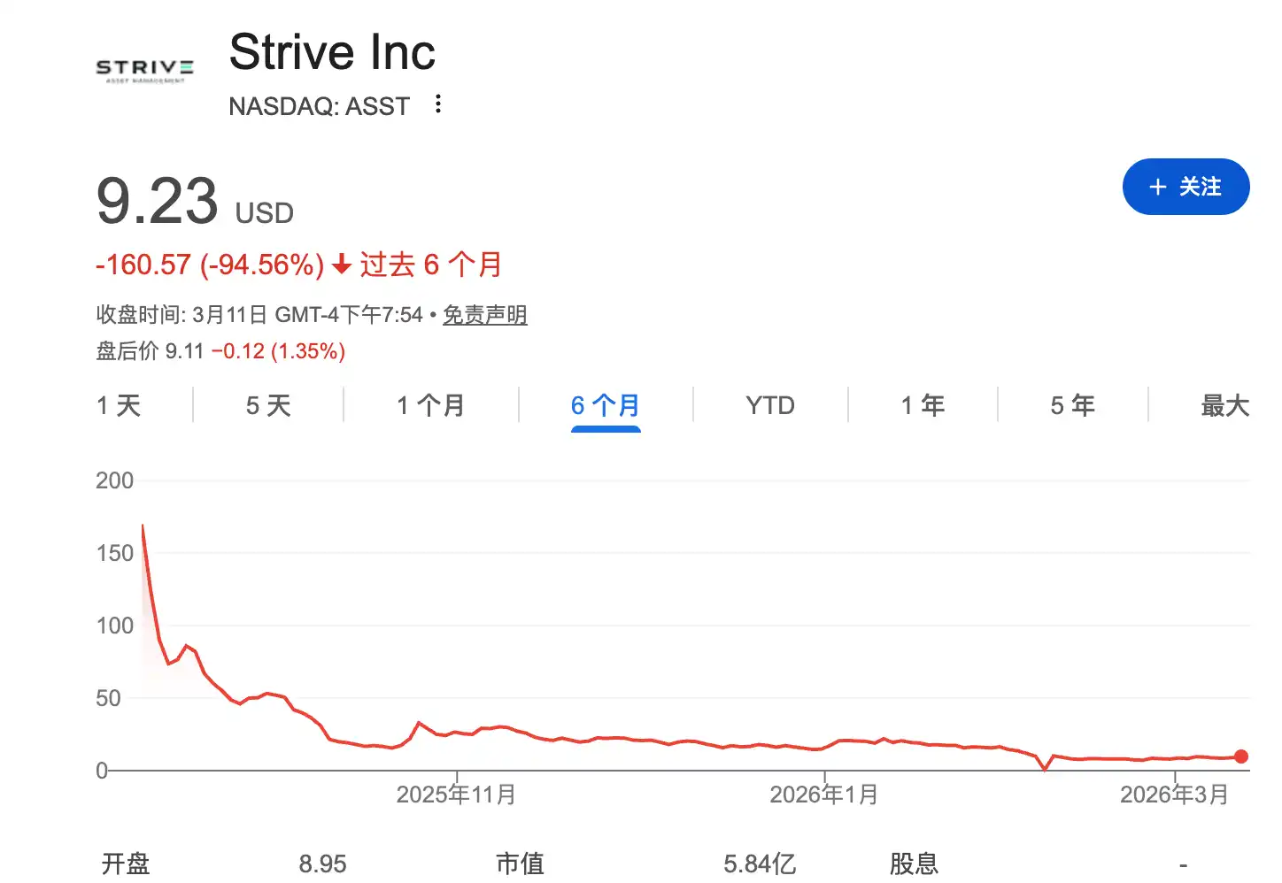 而 Strive 自家股票 ASST,最近 52 周最高点曾达 268 美元,现在不到 9 美元,跌幅达 97%。在宣布购买 STRC 的当天(3 月 11 日),股价仅上涨了 5.52%。